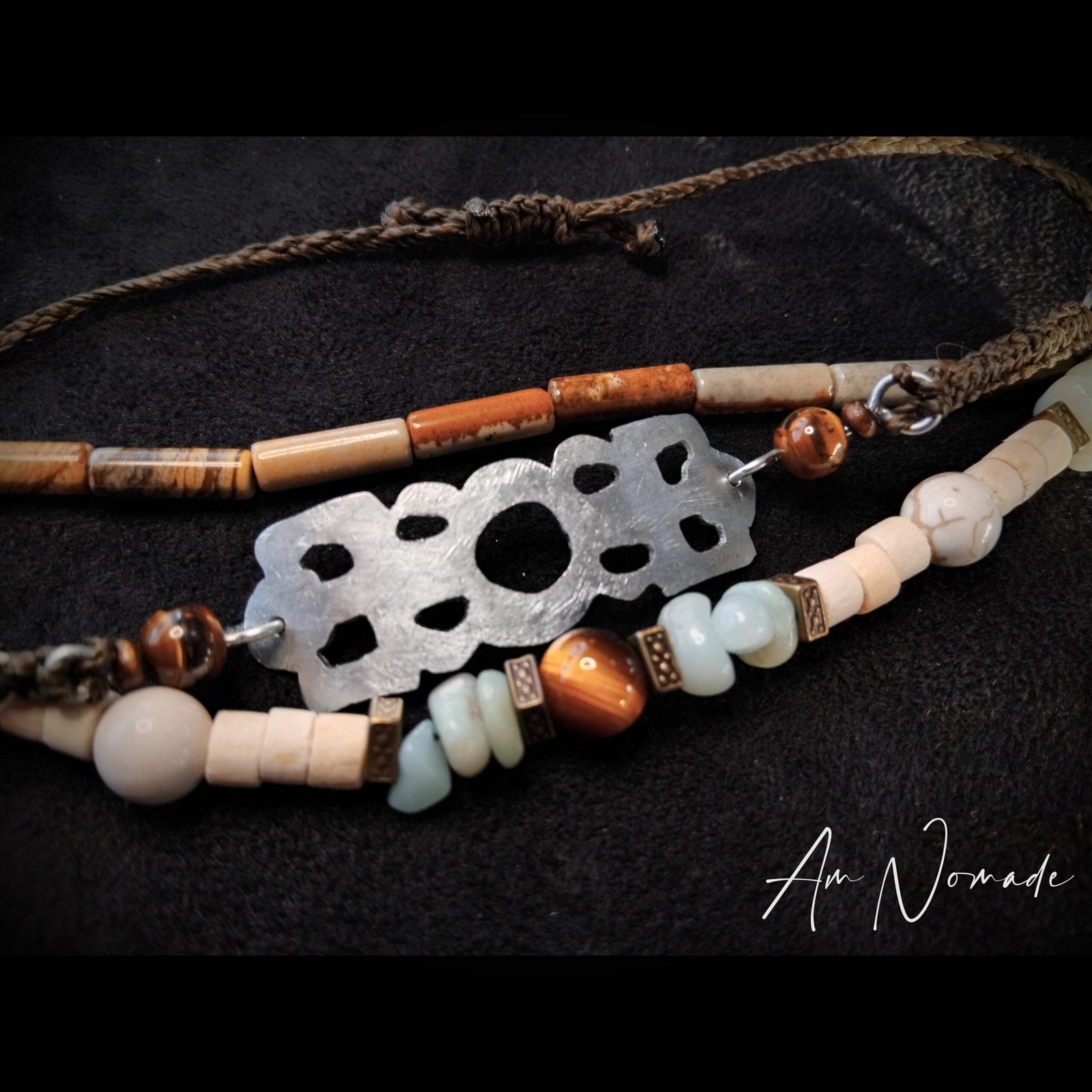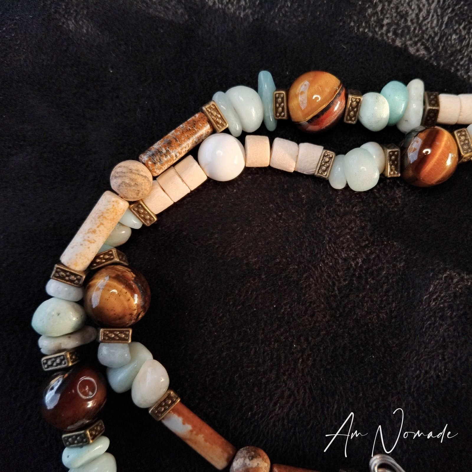 Collier en zinc, os, magnésite, amazonite, oeil de tigre, agate du botswana, laiton