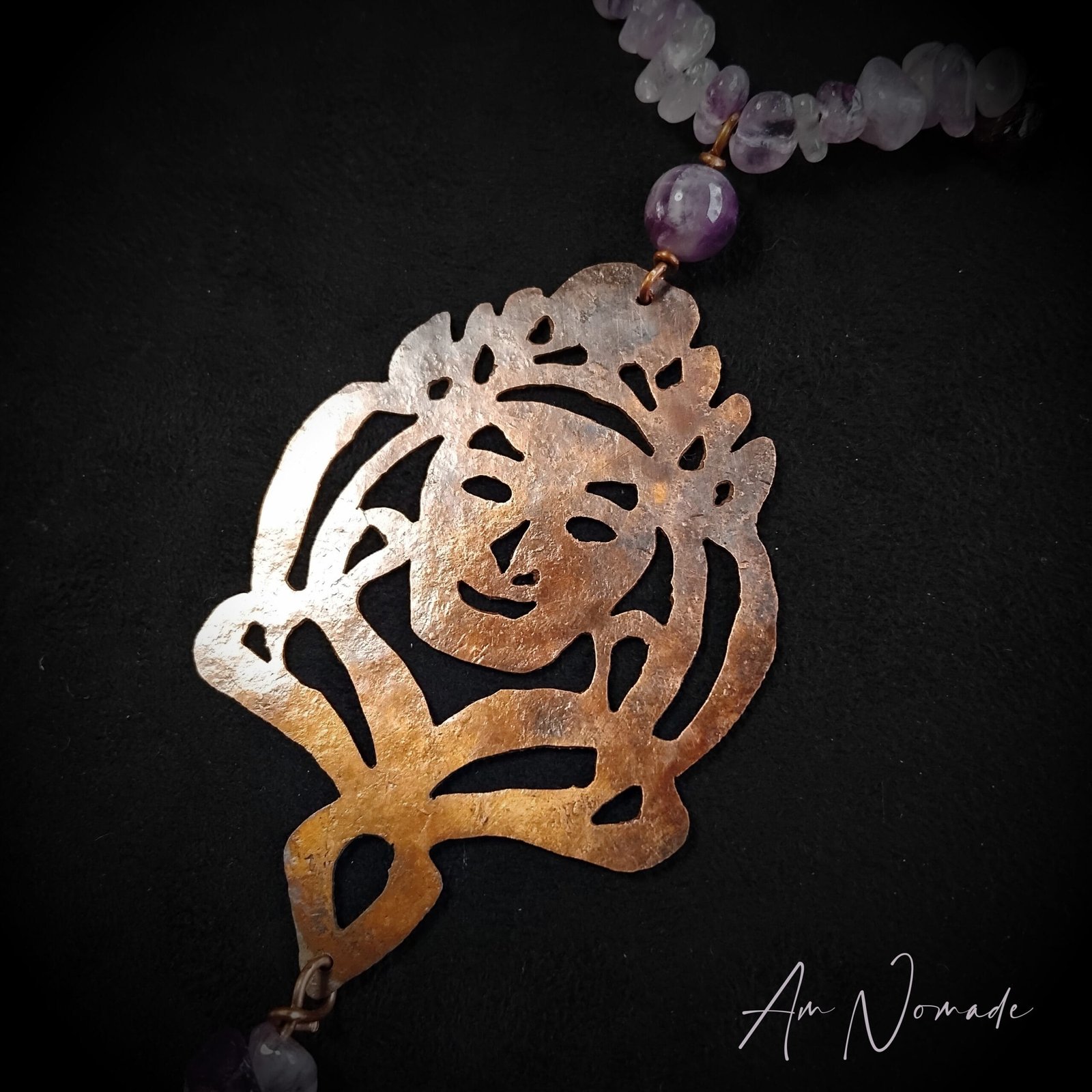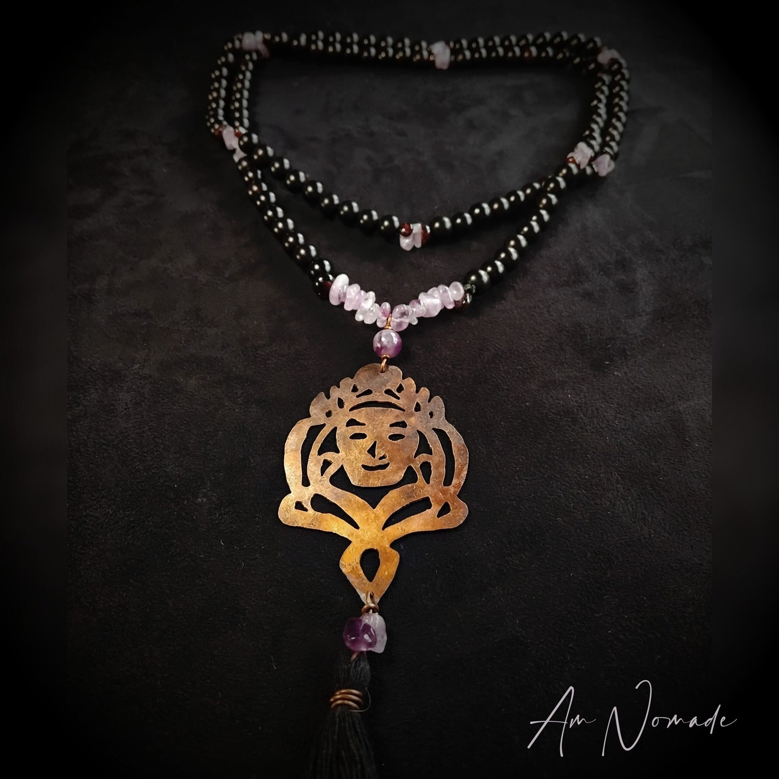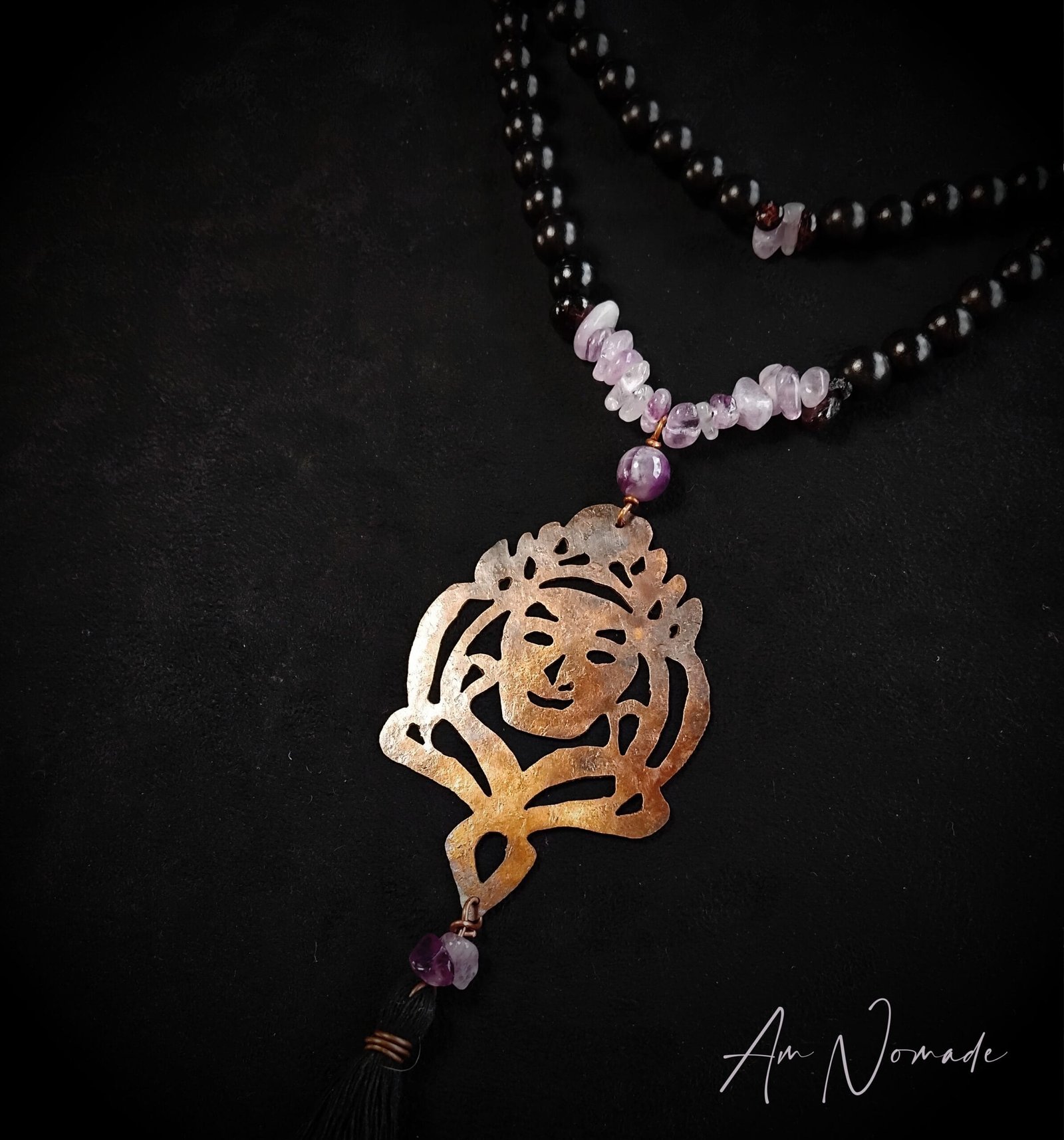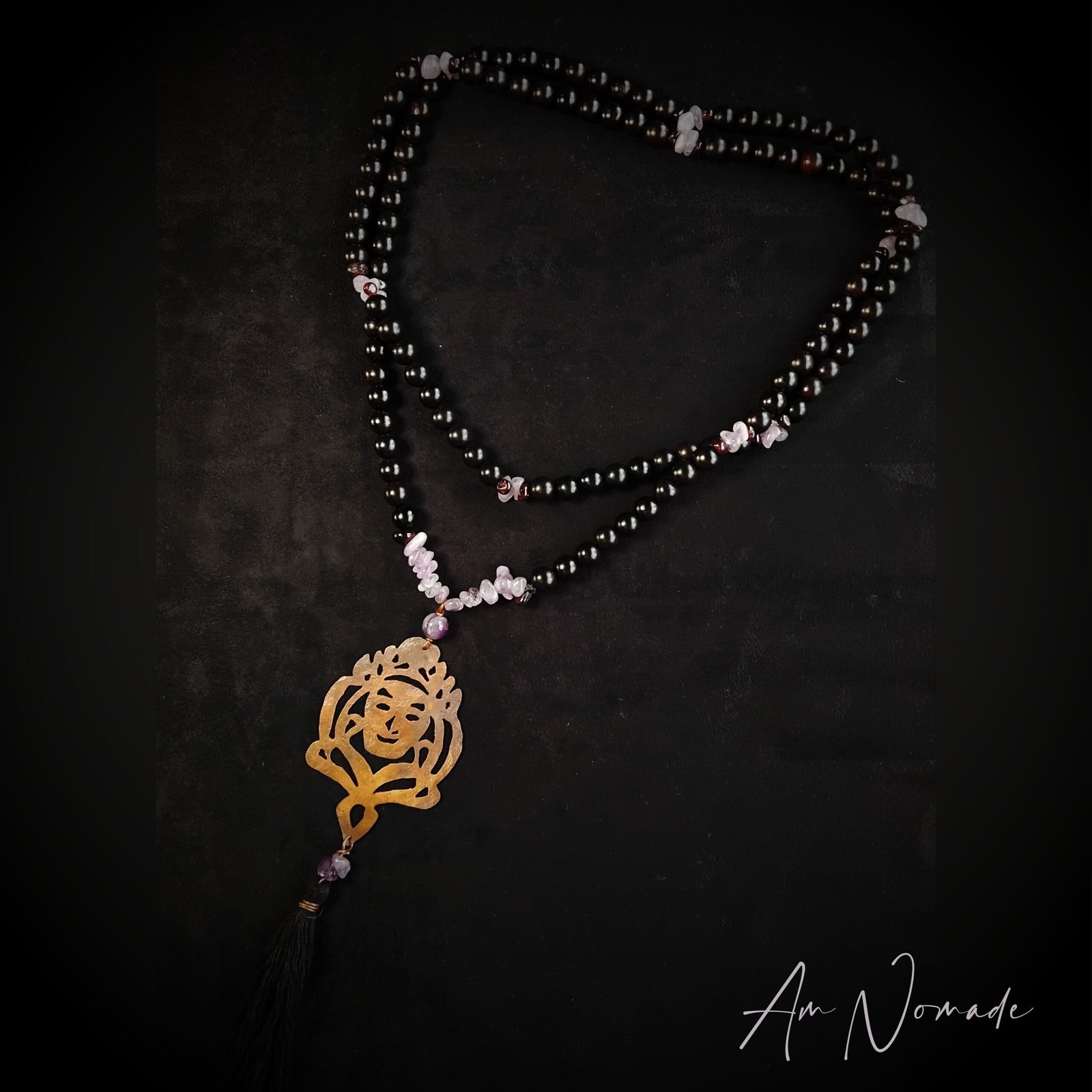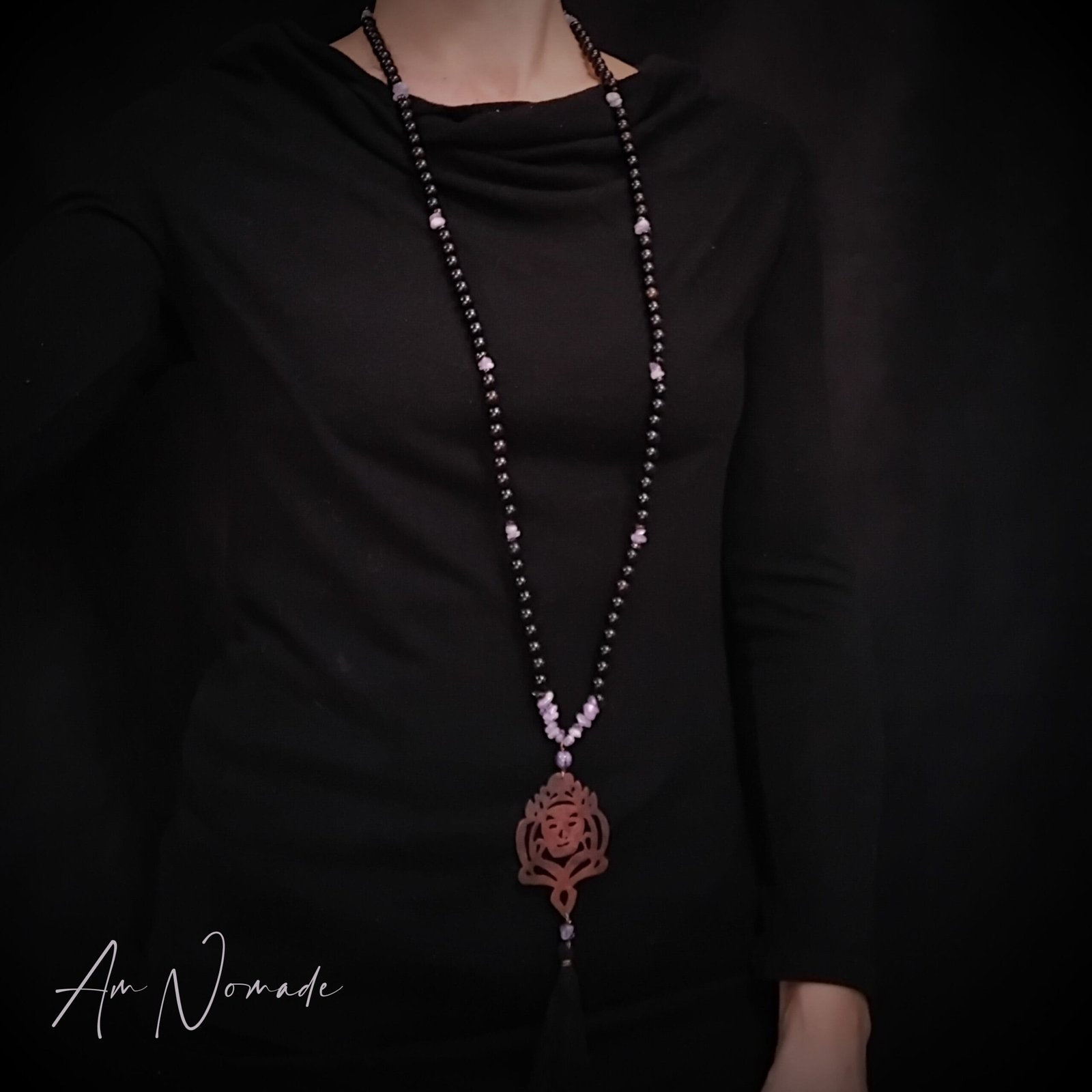 Bien que mes compositions puissent être plus ou moins complexes, tous mes bijoux restent légers et confortables à porter : c’est le cas de ce collier de méditation Le Guide !