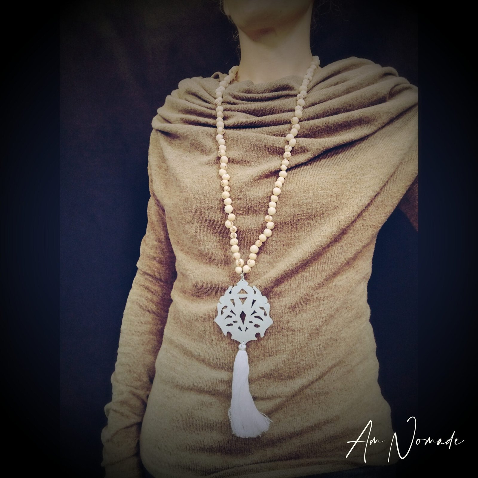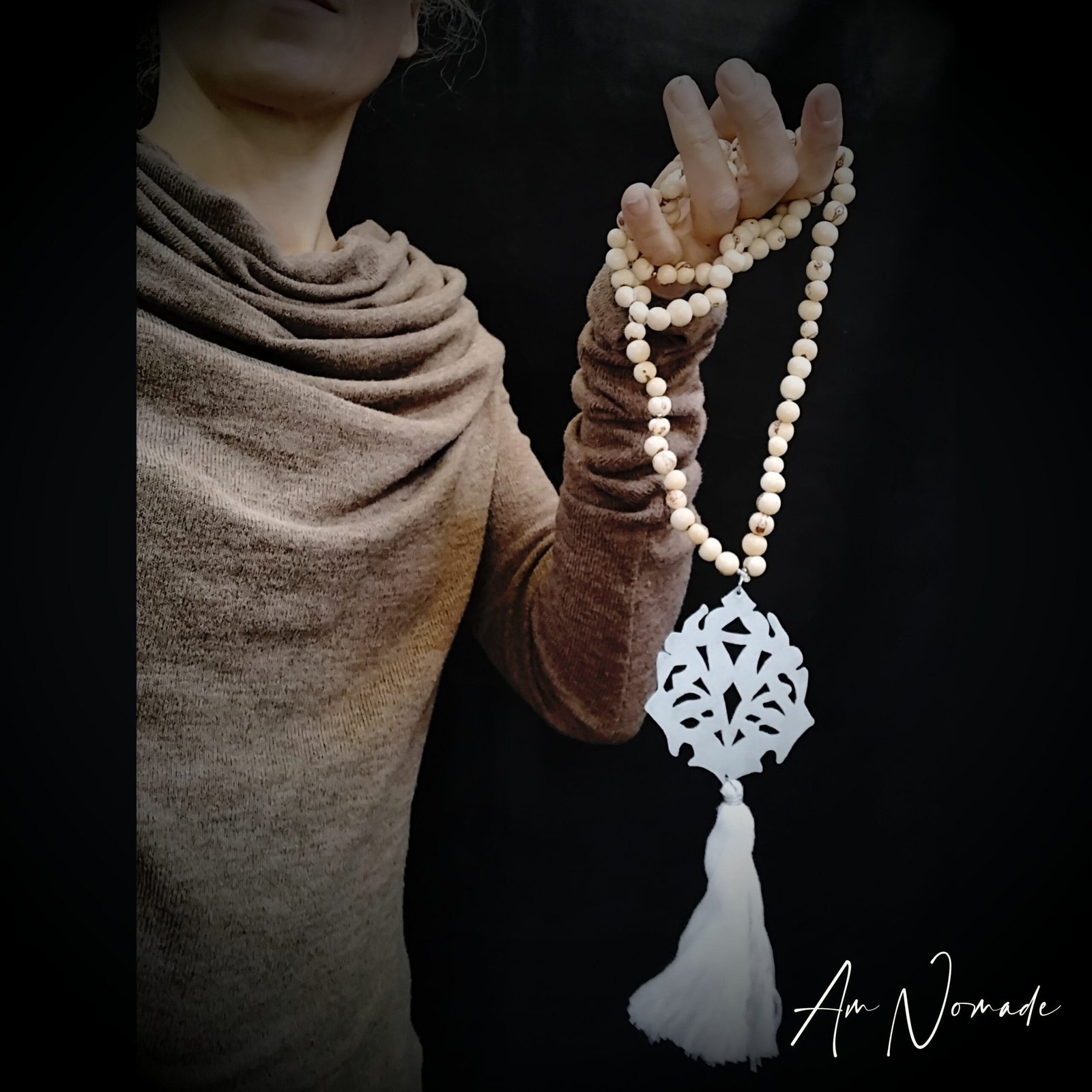 Bien que mes compositions puissent être plus ou moins complexes, tous mes bijoux restent légers et confortables à porter : c’est le cas de ce collier de méditation !
