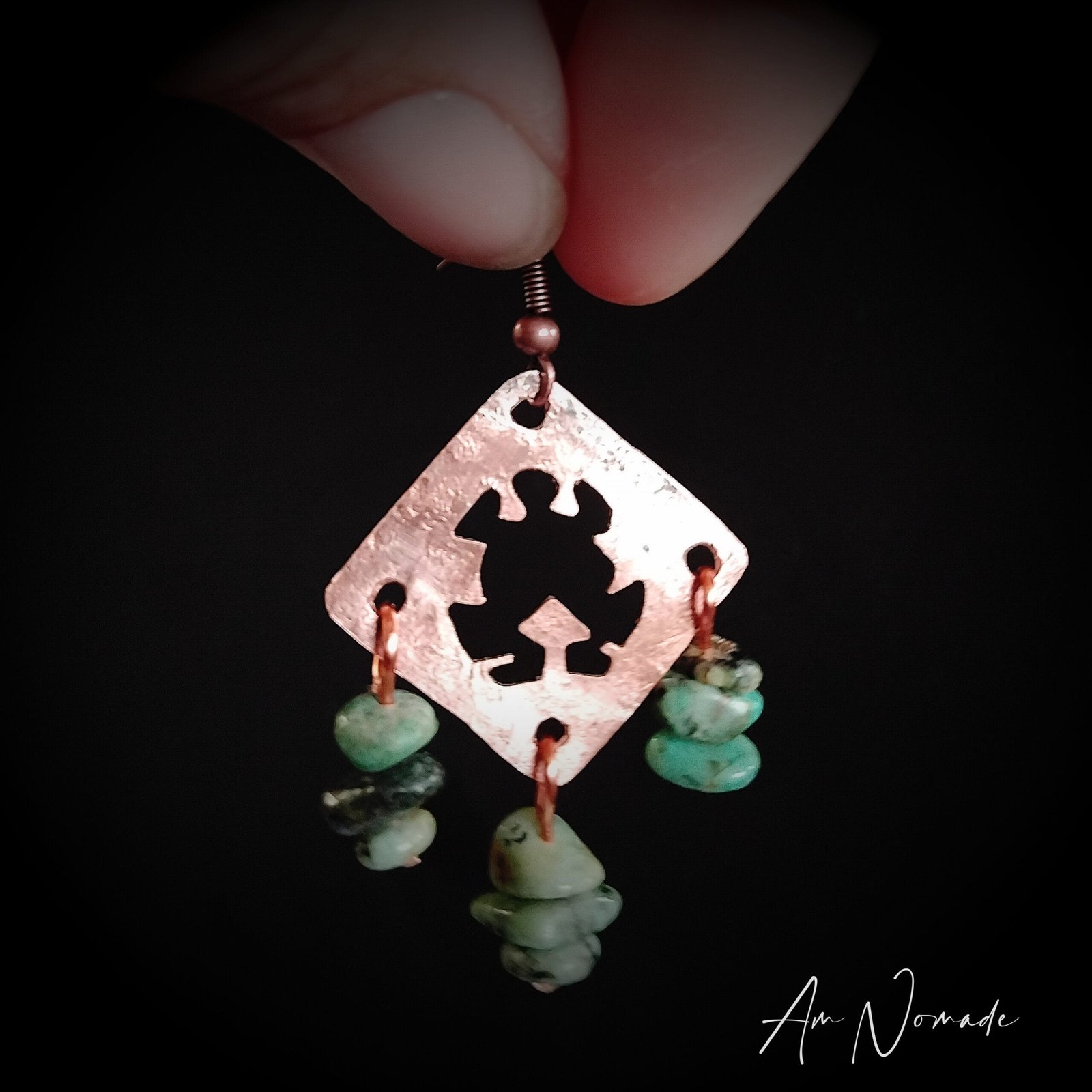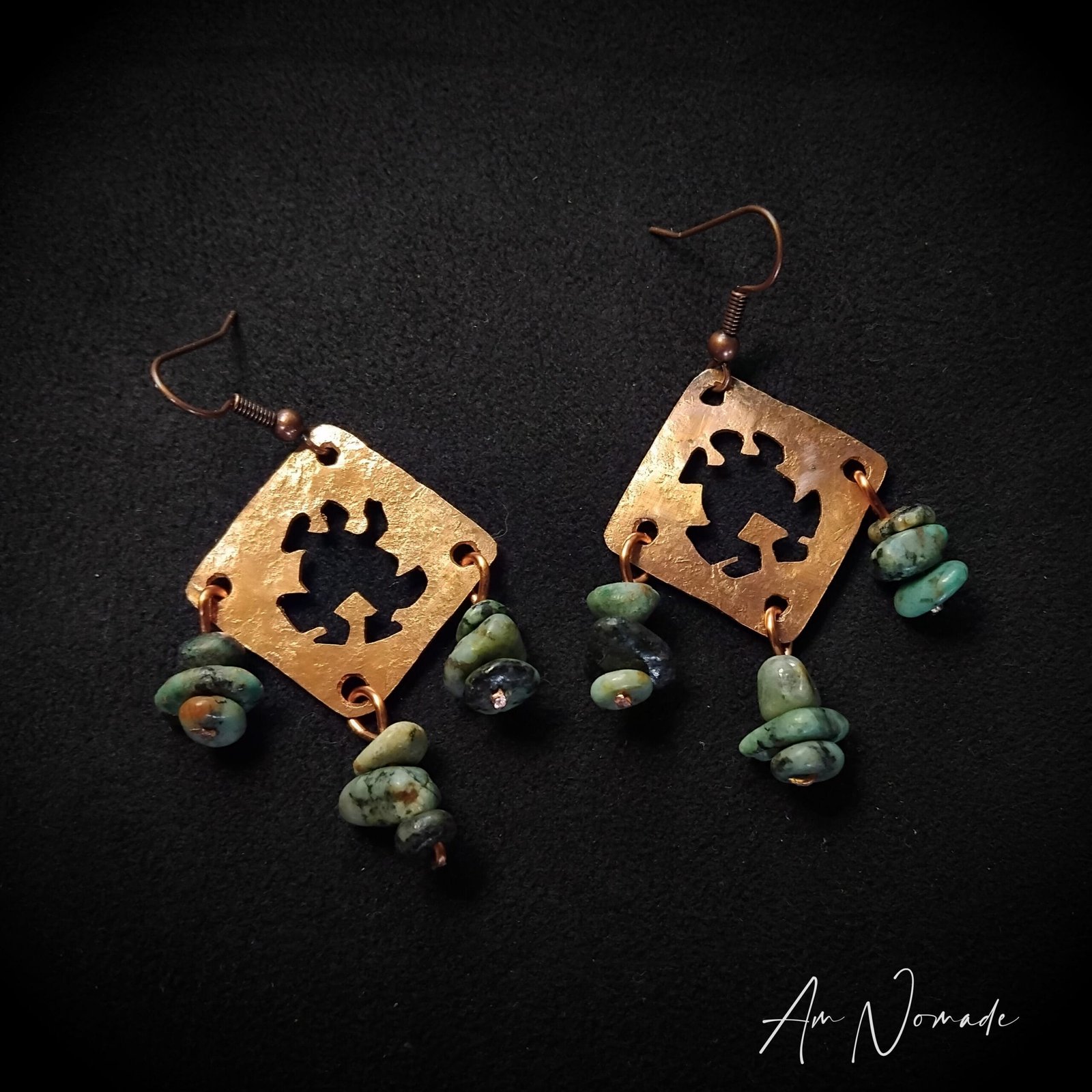 J’ai choisi la nature des perles naturelles des boucles d’oreille Métamorphose en suivant mon ressenti de la vibration. J’ai ressenti la chaleur et la vibration vivante du cuivre en association avec l’authenticité de la turquoise.