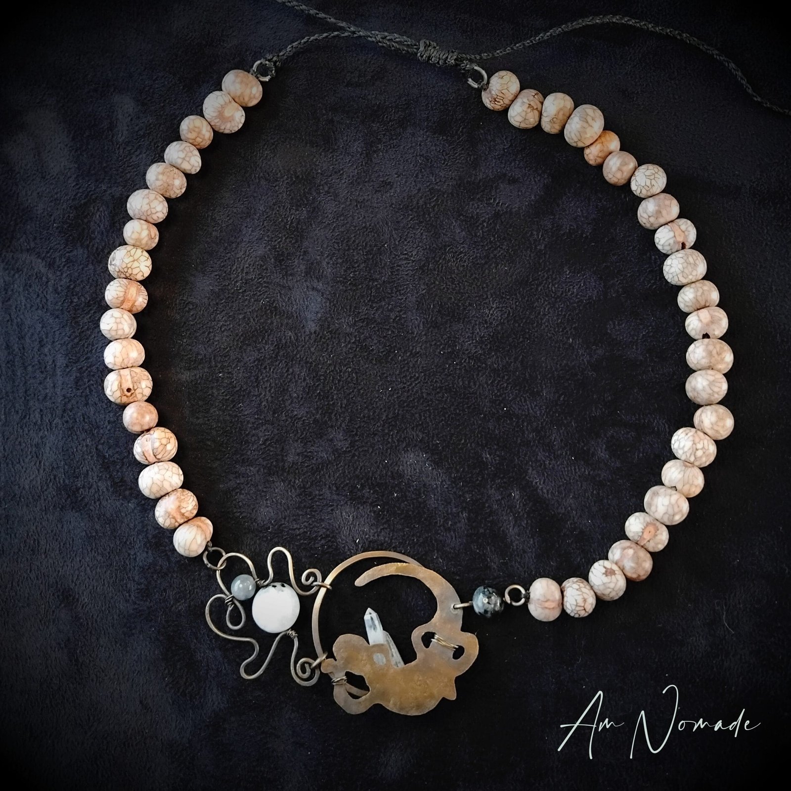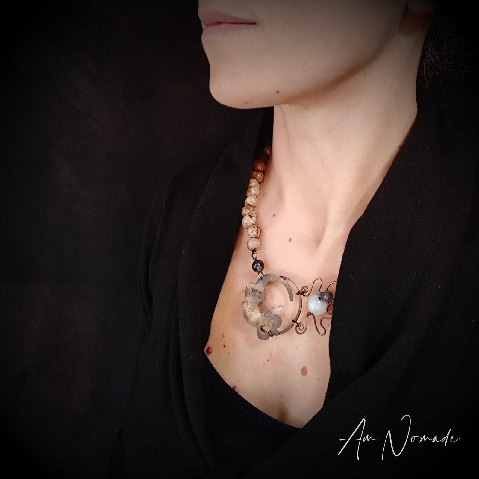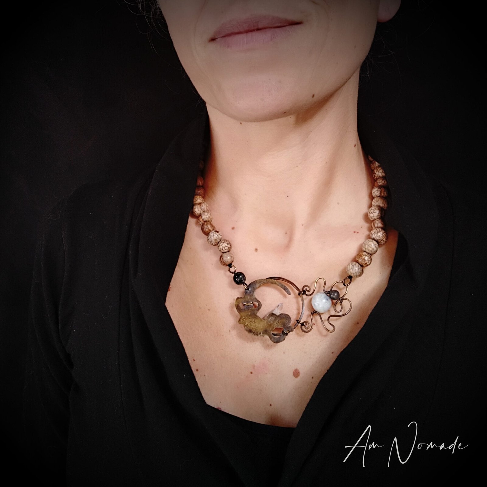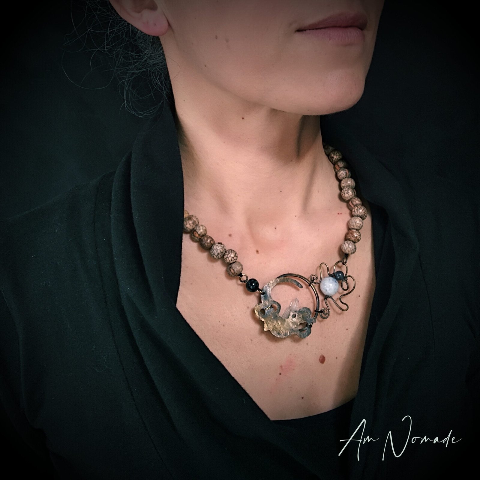 Bien que mes compositions puissent être plus ou moins complexes, tous mes bijoux restent légers et confortables à porter : c’est le cas de ce collier réglable « Rai Salamandre »!